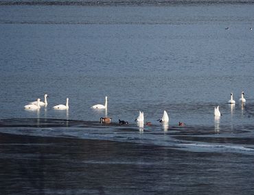 Tell folks about our trumpeter swans on northeast Lake Mallalieu. Trumpeter swans are fabulous--these white birds are the largest waterfowl native to North America, and they really do sound like trumpets! Our over-wintering trumpeter swans feed on aquatic plants in northeast Lake Mallalieu's ice-free, shallow water—they dip their heads and necks below the water surface and use their bills to uproot plants, and they tip “bottoms up” to reach the lakebed. Unmated birds mingle to form bonded pairs—they court by bobbing their heads and quivering their wings while facing each other.